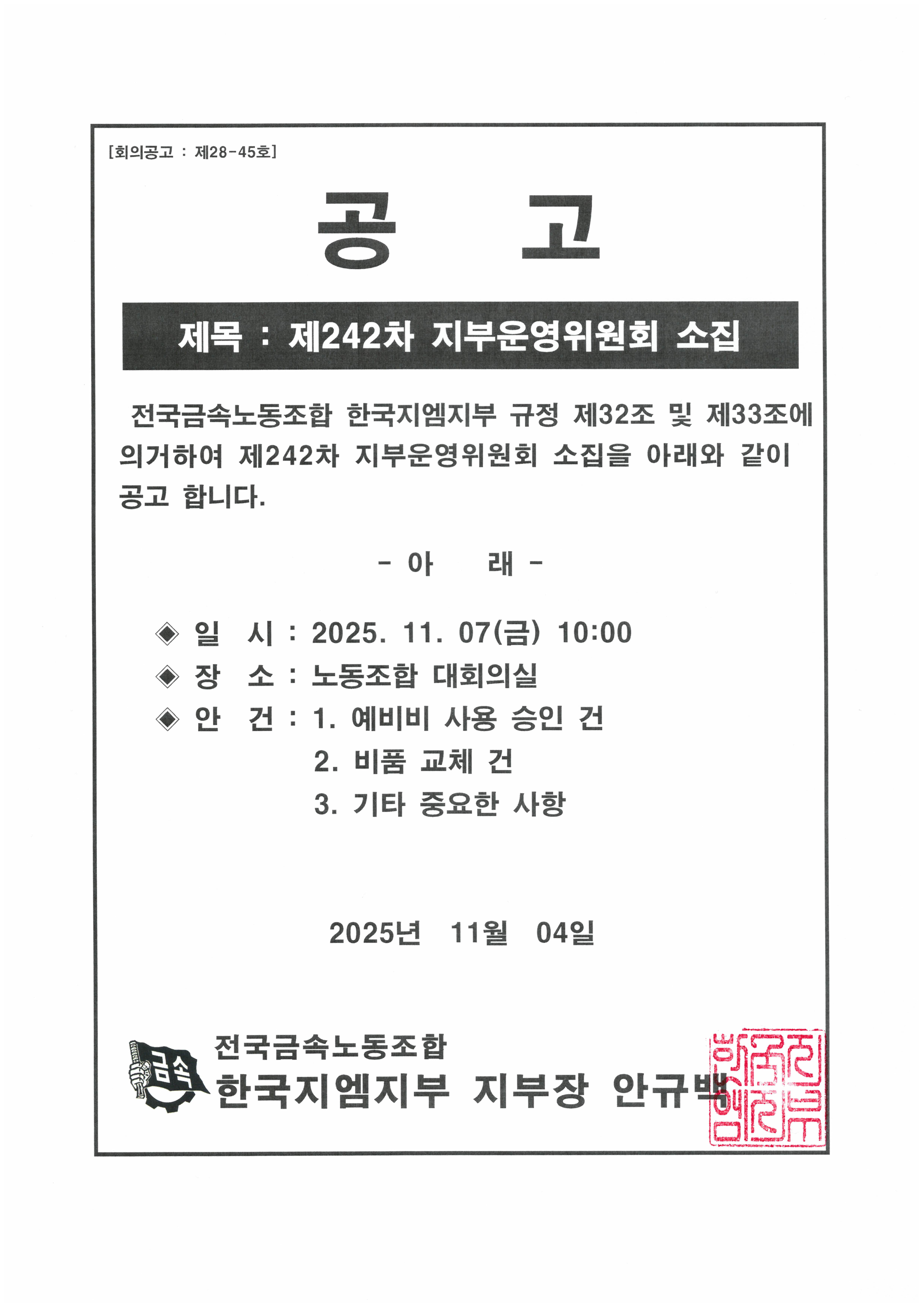 Àü±¹±Ý¼Ó³ëµ¿Á¶ÇÕ Á¦14±â ÀÓ¿ø¼±°Å °ø°í