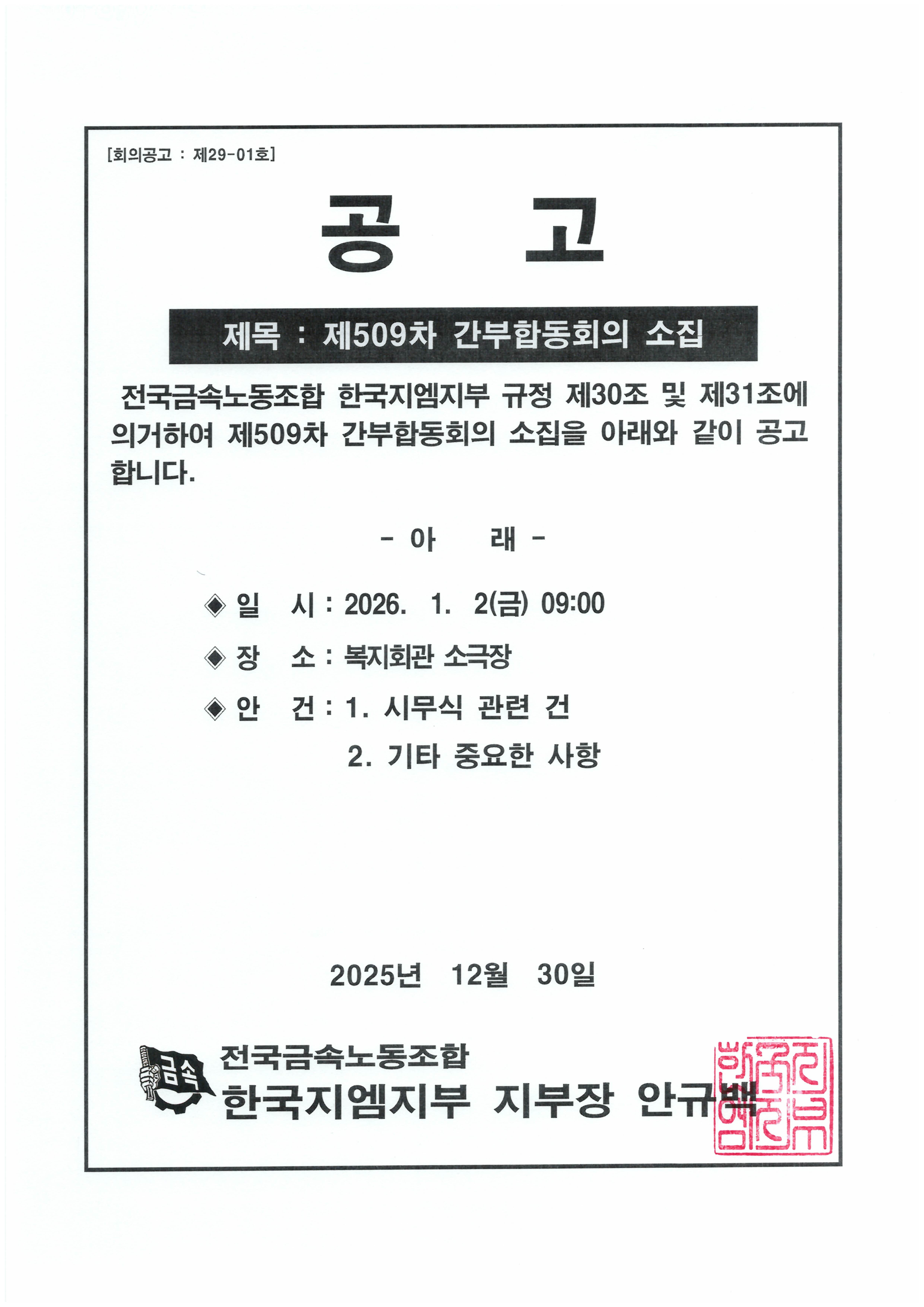 Á¦509Â÷ °£ºÎÇÕµ¿È¸ÀÇ ¼ÒÁý °ø°í