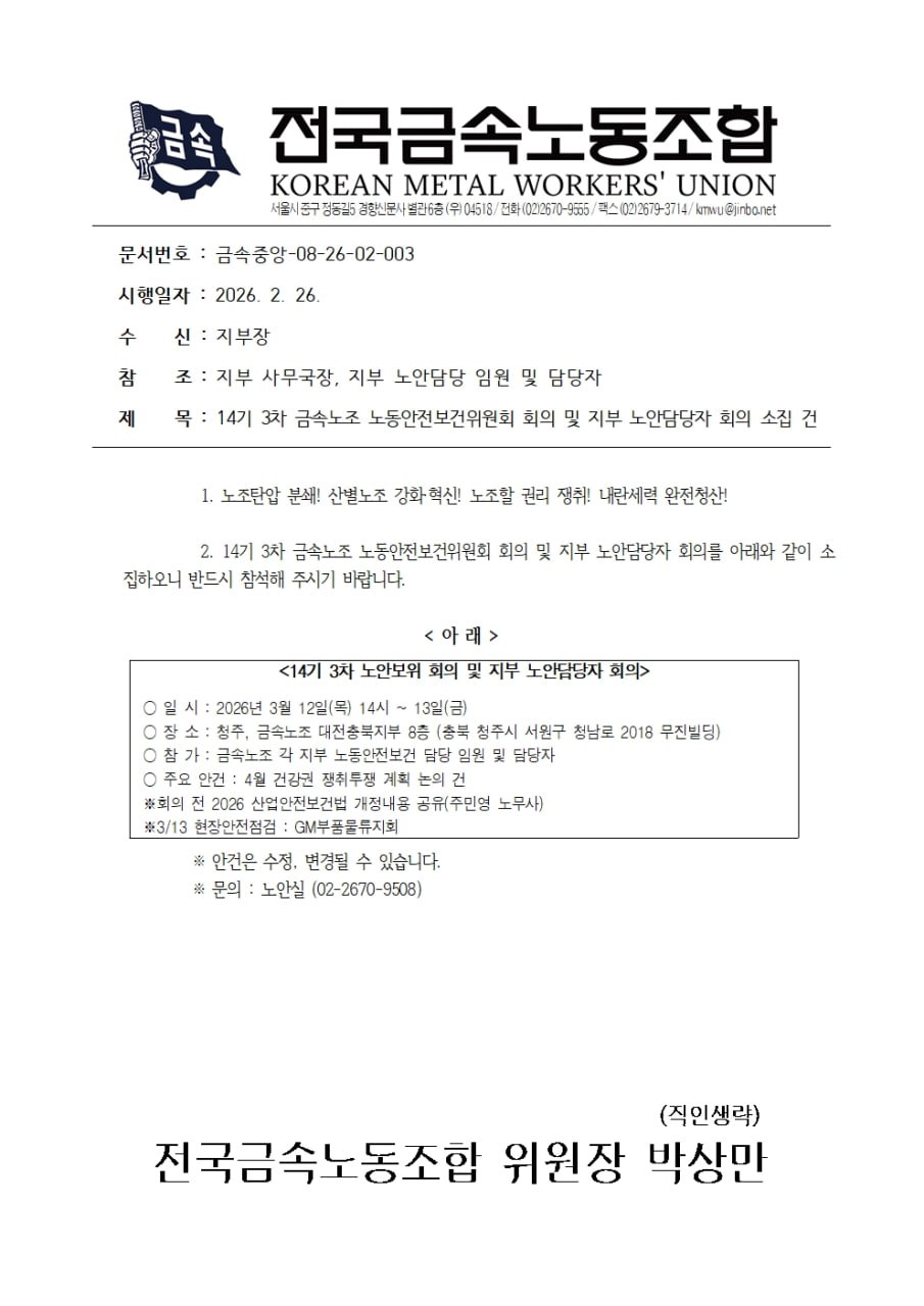(03/12~13) 14±â3Â÷ ±Ý¼Ó³ëÁ¶ ³ëµ¿¾ÈÀüº¸°ÇÀ§¿øÈ¸ ȸÀÇ ¹× ÁöºÎ ¡¦