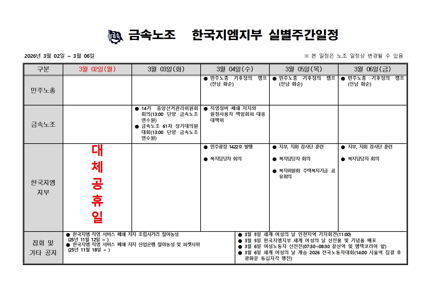 2026³â 3¿ù 2ÀÏ ~ 3¿ù 6ÀÏ ÁÖ°£ÀÏÁ¤Ç¥ ÀÔ´Ï´Ù