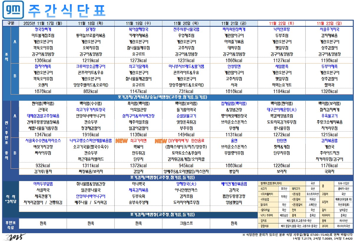 2025³â 11¿ù 17ÀÏ ~ 11¿ù 23ÀÏ ÁÖ°£½Ä´ÜÇ¥ÀÔ´Ï´Ù.