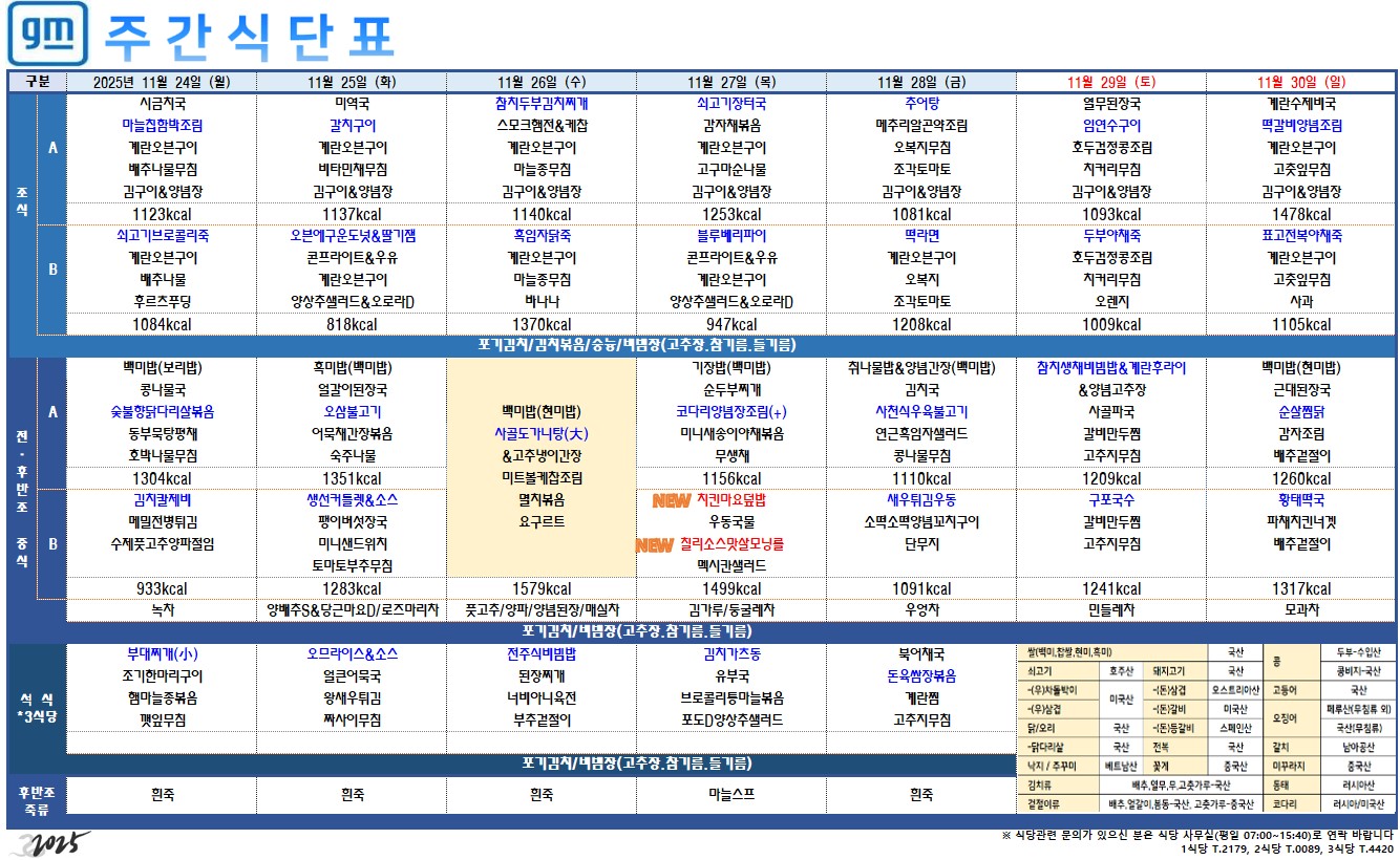 2025³â 11¿ù 17ÀÏ ~ 11¿ù 23ÀÏ ÁÖ°£½Ä´ÜÇ¥ÀÔ´Ï´Ù.