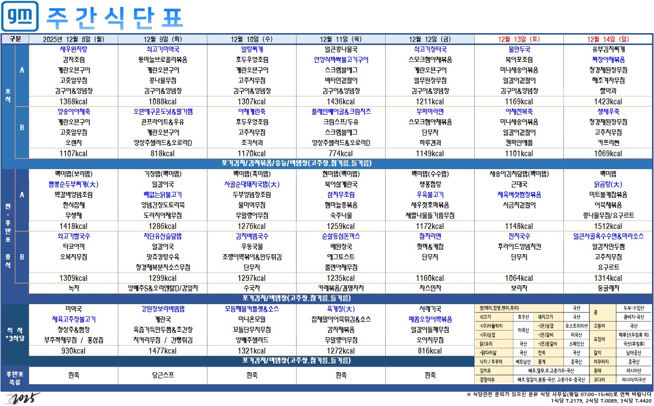 2025³â 12¿ù 08ÀÏ ~ 12¿ù 14ÀÏ ÁÖ°£½Ä´ÜÇ¥ÀÔ´Ï´Ù.